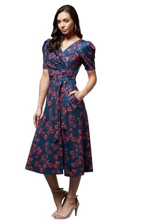 Miss Chase Women's Multicolored-Base-Blue V-Neck Pleated Puff Sleeve Floral Wrap Midi Polyester Dress