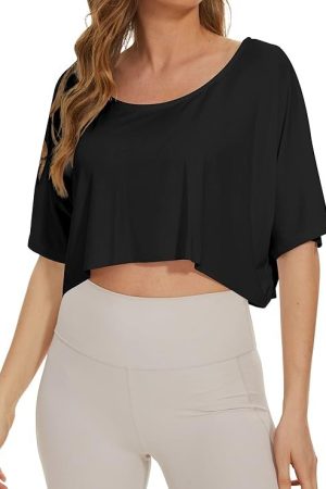 MISSACTIVER Women's Oversized Half Sleeve Boat Neck Crop Tee Shirt Workout Off Shoulder Relaxed Basic Cropped T-Shirts Top