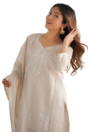Soch Womens Off White Viscose Blend Suit Set With Beads And Stones