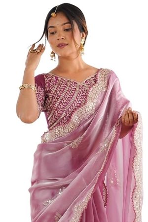 SIRIL Women's Tissue Silk Sequence Embroidery Scalloped Border Saree With Unstitched Blouse Piece