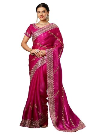 SIRIL Women's Organza Sequence Embroidery Scollped Border Saree With Unstitched Blouse Piece