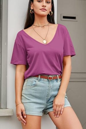Eachyes Women's Deep V Neck Casual Short Sleeve Loose Fit Fashion T Shirt