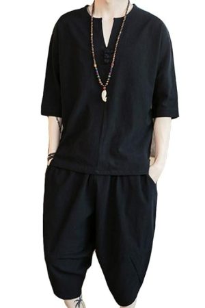 foveitaa Summer Clothing Men's Loungewear, Japanese Clothes, T-shirt, 3/4 Sleeves, Hemp Shirt, Short Sleeve, Top and Bottom Set, Top, Half Pants, Shorts, Top and Bottom
