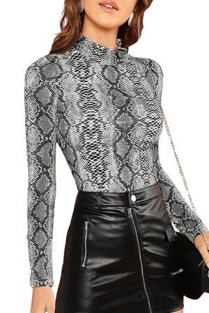 Floerns Women's Long Sleeve Mock Neck Slim Snakeskin T Shirt Tops