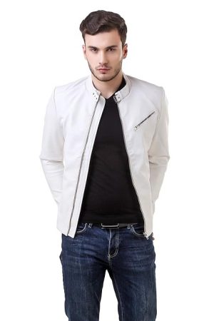Leather Retail Faux Leather Men's White Solid Biker Jacket