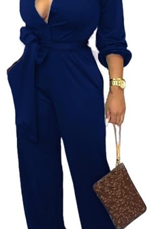SxClub Jumpsuits for Women Formal Sexy Elegant Long Straight Pants Busineess Party Jumpsuit with Belt Pockets, Dark Blue, Small