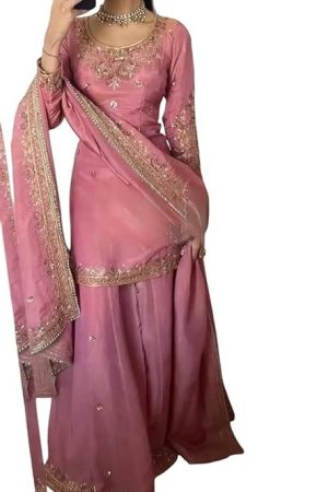 PORWAL CRAFT Women's Pure Chinnon Silk Embroidered Kurti with Sharara & Dupatta Set