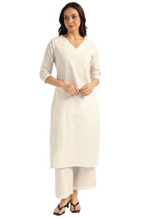 BLOCKS OF INDIA Women's Solid Straight Kurta Set | Hand-Stitched Neck Details with Pintucks | Comfortable Pants with Pockets, Elastic Waist & Drawstring Fit