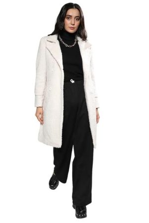 Campus Sutra Women's Polyester Double-Breasted Standard Length Long Coat For Casual Wear | Lapel Collar | Long Sleeve | Button Closure | Soft Coat Crafted With Comfort Fit For Everyday Wear